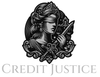 A grayscale illustration of a woman in a classical style holding a sword and a set of scales, with the words 'CREDIT JUSTICE' below.